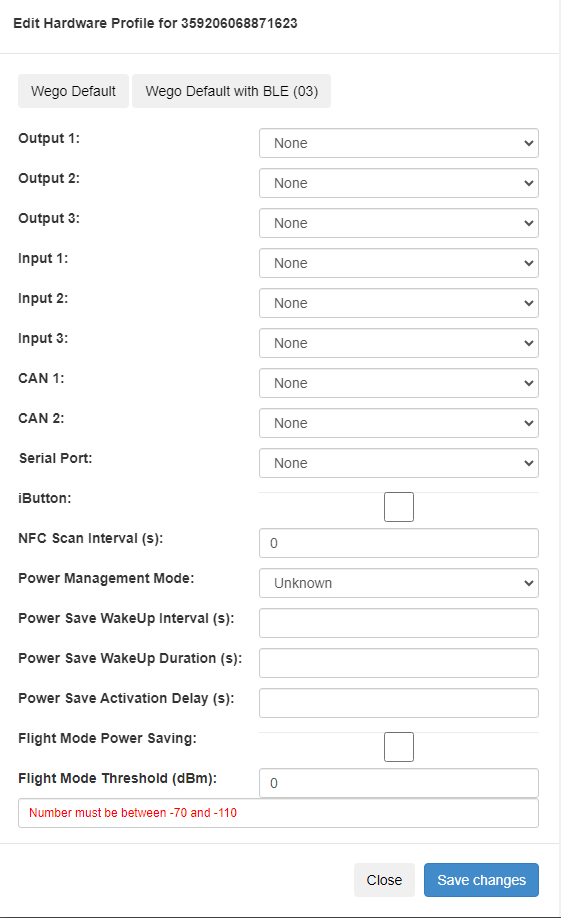 - The user can enter the details manually or fields can be filled with default values automatically by selecting either one of ‘Wego Default’ and ‘Wego Default with BLE (03)’ that can be seen at the top of the pop up box.